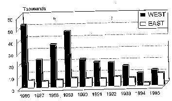 Figure 2: Estimated number of spawning sea lampreys in U.S. waters (west and east of Keweenaw Peninsula) of Lake Superior 1986-1995.