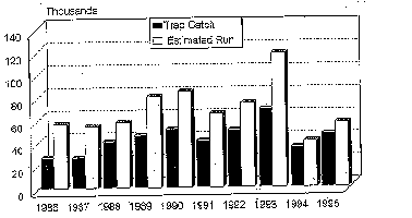 The Service and Department annually have trapped spawning-phase sea lampreys in an average of 6 tributaries since 1986 and estimated the number of spawning lampreys in Cattaraugus Creek during 1991-95 (Fig. 5). Current catches are significantly less than those prior to the start of lampricide management (first round of treatments conducted in 1986/87 and showed effect in spawner population by 1989) but are greater than 10% of pretreatment catches. Since lake trout wounding remains at less than 5%, we are achieving sea lamprey objectives in the lake.